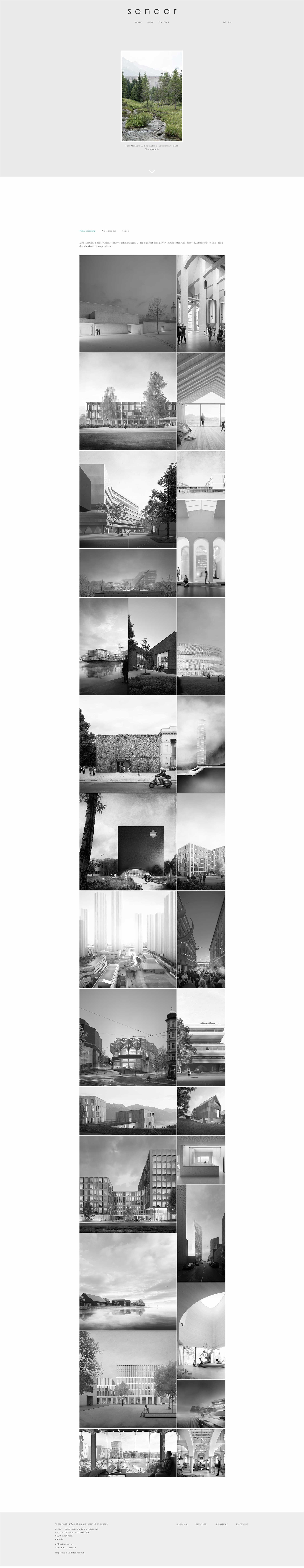 Der Onlineauftritt hat die Aufgabe die Arbeiten des Studios Sonaar zu präsentieren und zu forcieren. Die Architekturvisualisierungen und Architekturfotografien sind sehr vielfältig und zeigen mehrere Darstellungsmethoden auf, was bedeutet, dass das Design der Website nicht dominieren darf sondern lediglich für eine geordnete Struktur sorgen soll. So wie auch das Studio muss die Website zum Charakter der Künstler passen und deren Arbeitsweise bestmöglich kommunizieren.